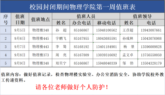 各位老师,为保障学院日常工作的顺利进行,学院拟安排人员入校值班,如有工作需要,请联系当日值班人员。