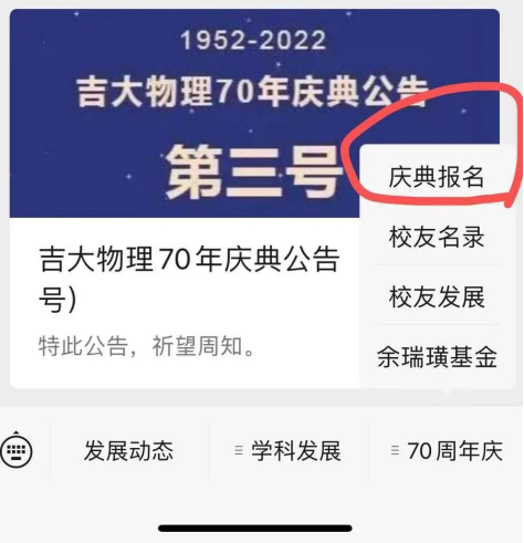 ”。进入公众号后点击菜单,选择庆典报名注册;截止日期为11月5日。