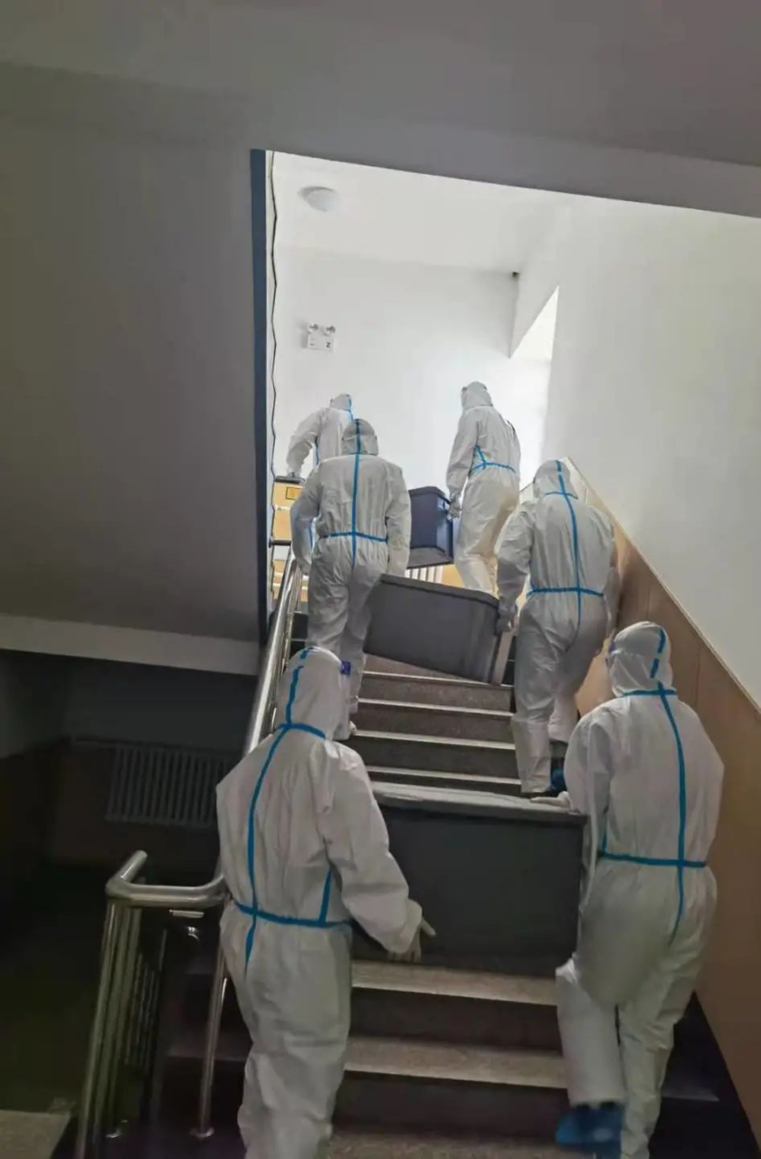 志愿者伙伴们一起下楼接收物资,寝室楼外,雪花在乌云下舞蹈,搬水进楼的志愿者身上夹杂着寒风与雪花的味道,让我不禁打了一个寒颤,没有心情欣赏雪景,也没有时间反应身体感受到的寒冷,我们这时脑子里只有一个念头,那就是尽快把水送到南五A每一位同学的手里!我们撸起袖子,争分夺秒,完成任务后,大家的额头都流着汗水,冒着热气,胳膊都已抬不起来,但是没有一个人喊苦喊累,大家脸上都洋溢着笑容。