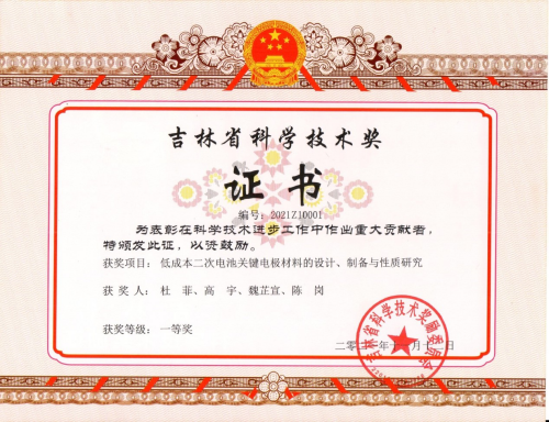 2021年11月19日,吉林省科学技术厅发布了《关于2021年度吉林省科学技术奖励的决定》。由我院杜菲教授研究团队完成的“低成本二次电池关键电极材料的设计、制备与性质研究”研究成果荣获吉林省自然科学奖一等奖。