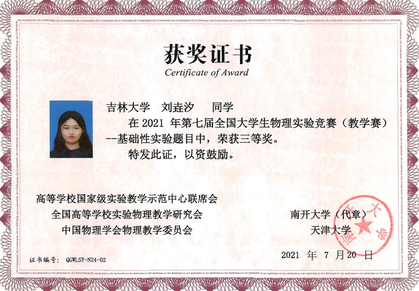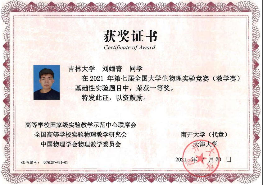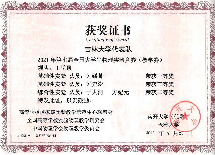 的4名本科生组成,他们在比赛中取得了佳绩:2019级本科生刘蟠菁获基础性实验一等奖,2019级本科生于大河、方纪元获综合性实验二等奖,2018级本科生刘垚汐获基础性实验三等奖,我校荣获竞赛优秀组织单位。