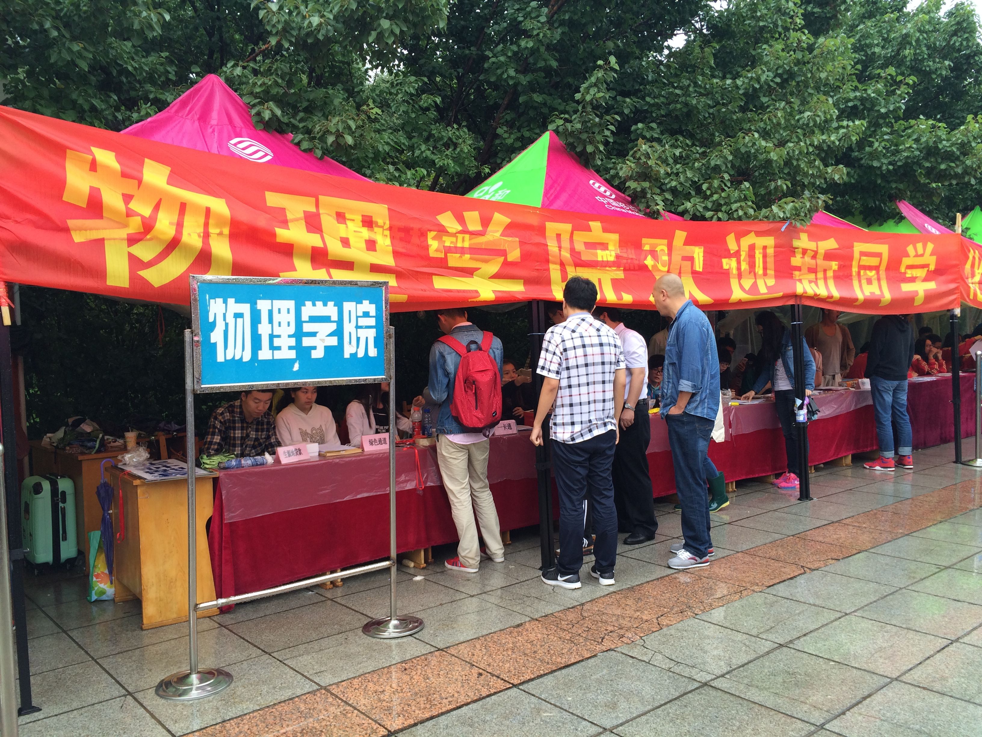 8月29日上午的五月花广场,同学们的工作正如火如荼地进行着。新生的文件袋以班级分类整齐的放置在箱子中,各项工作有条不紊地进行着。负责办理入学手续的志愿者们身穿蓝色的漫蛙