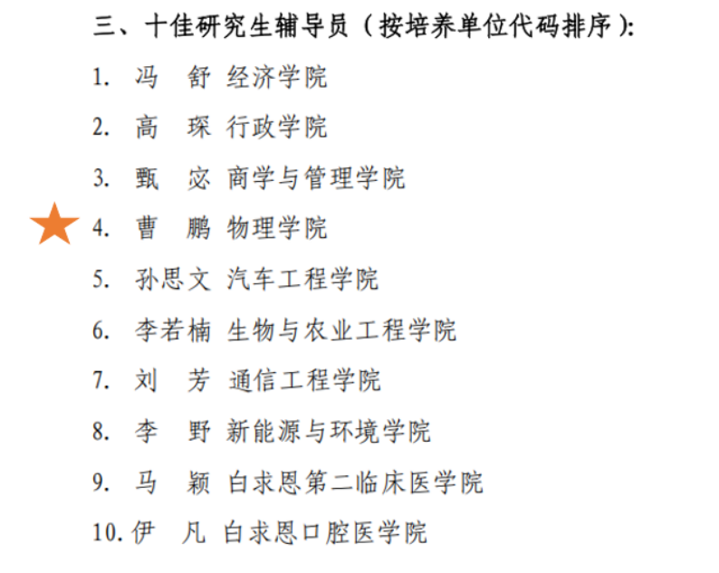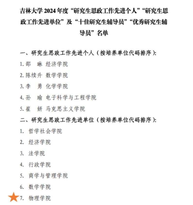 本年度,2021级博士研究生陆文成获“十佳博士研究生”,2021级博士研究生王奎获“吉林省优秀大学生”,2023级博士研究生代政辰等3人获校“优秀共产党员”,2023级博士研究生侯鹏飞入选研究生“青云计划”,2021级博士研究生崔政获“学雷锋标兵”,2022级硕士研究生王乐强等6人获“优秀志愿者”;2019级博士研究生尚宇琛获“第七届漫蛙