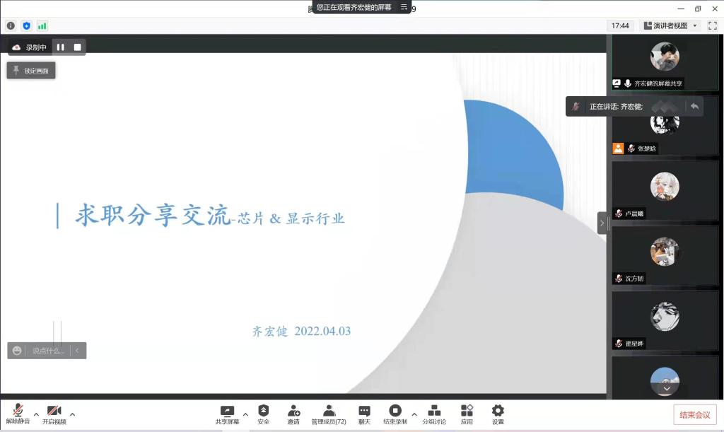 研究生团委和研究生会推出了“找准人生航向,铸就光辉未来”线上就业分享会。齐宏健、侯学鹏、骆嘉达、闫美洁、王宏岩五位同学分别从企业、教师、公务员篇讲述自己的求职就业经验,共有学院各年级160余名研究生参加了本次就业分享会。