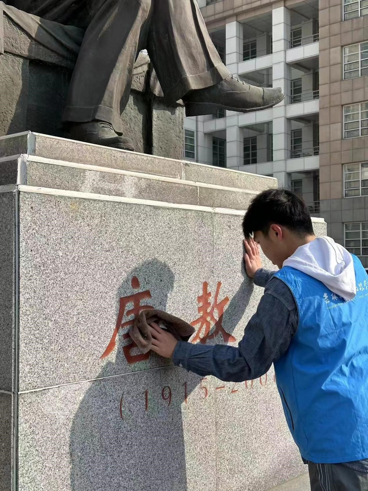 在擦雕像的活动中,同学们认真地擦拭着雕像的每一个角落,使之更加光彩照人,增强学生爱院荣院意识的同时,彰显了雷锋精神的伟大价值。