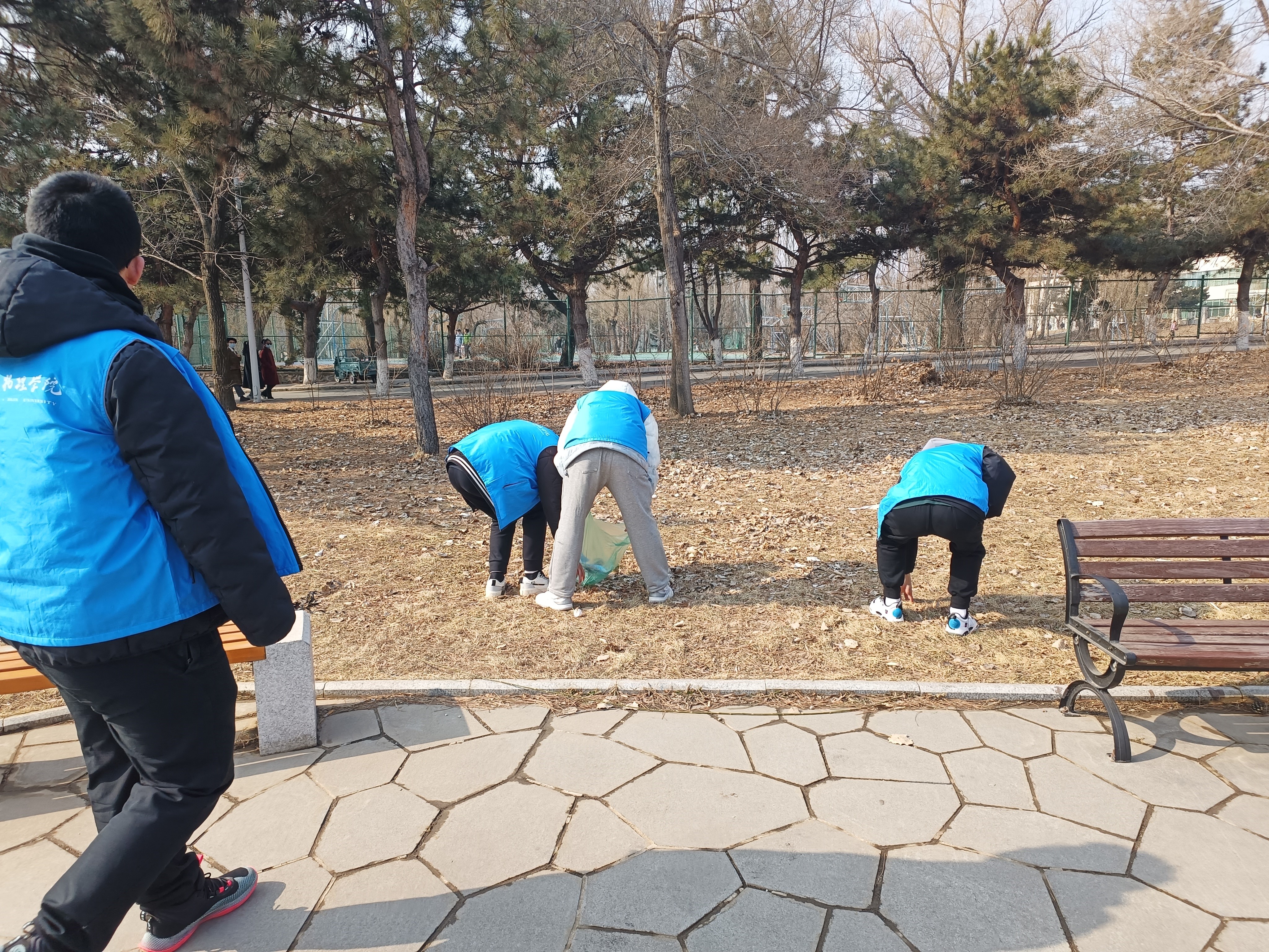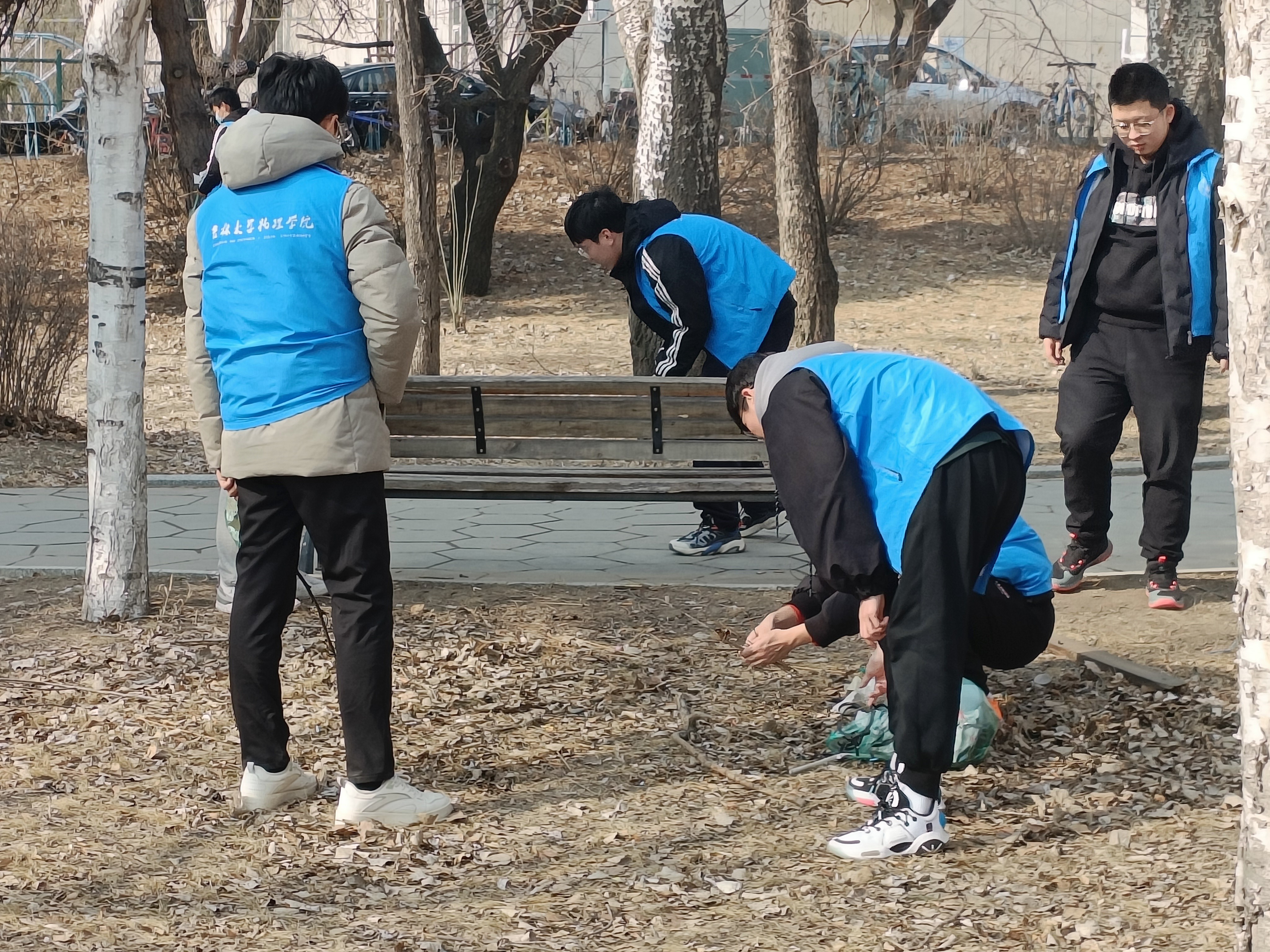 活动中,同学们统一着装,拿着扫把、垃圾袋等工具,有序的进行劳动。有的同学将草丛中的垃圾捡起来倒进垃圾袋;有的同学清理道路上的垃圾;有的同学用垃圾袋装好垃圾进一步处理。