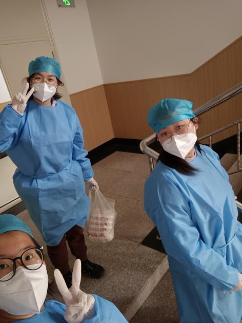 早晨六点,一声闹铃,标志着志愿者的一天从此刻开始,穿好防护服,在每个门前悄悄放下餐盒和牛奶。中午和晚上,志愿者们需要提前一个半小时左右去搬发餐食。纵向志愿者主要负责把寝室外的餐箱放到小推车上,推到宿舍里面,并且再把餐盒、酸奶、水果等物资分发到各层。横向志愿者负责把饭准确分发到每一个寝室。虽然做志愿者很累,但是大家依然选择站出来,做给大家提供便利的人。