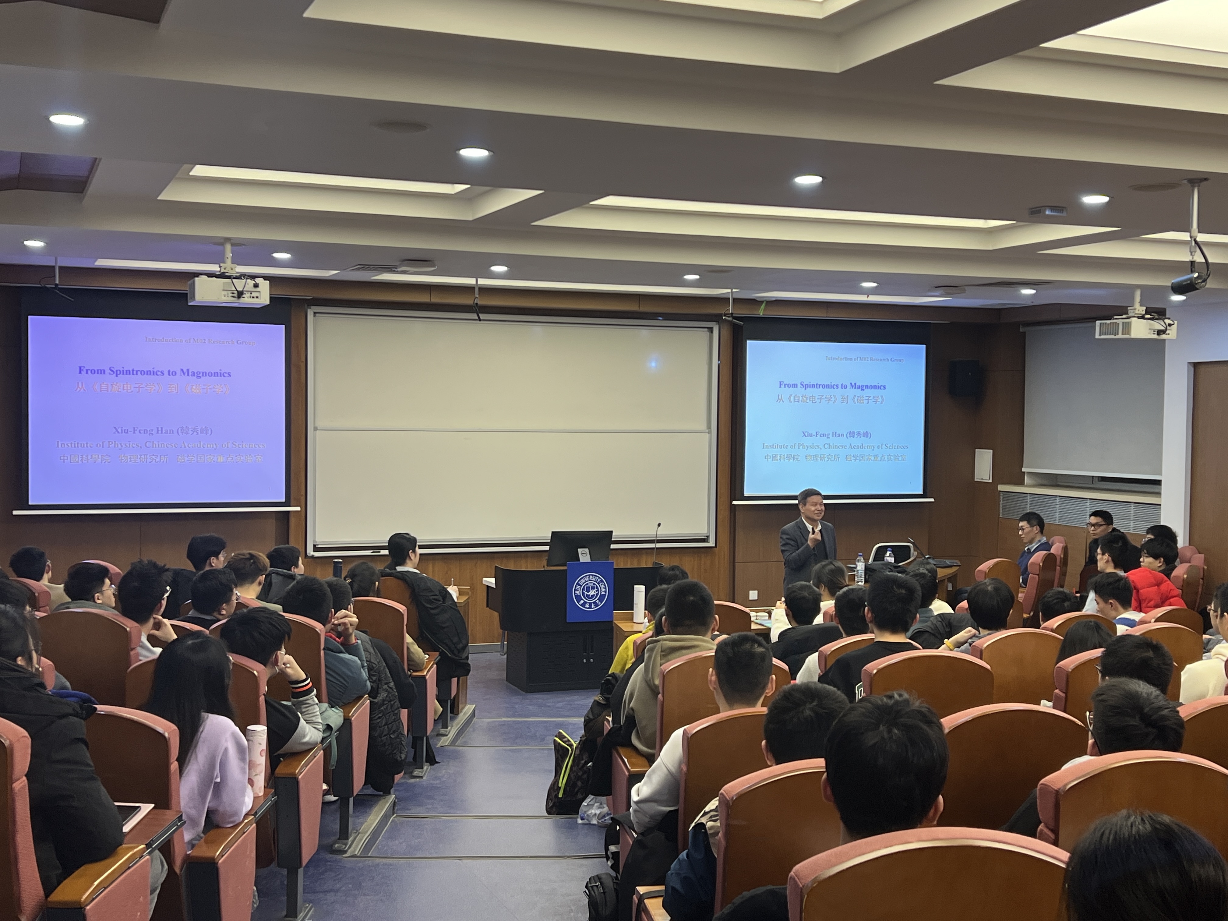 党委副书记兼副院长杨讴菡,本科生辅导员刘扬、车禹剑、赵一安出席活动。会场内座无虚席,同学们对宣讲会翘首以盼。首先杨讴菡书记为讲座进行了开场介绍,之后鲁年鹏特聘研究员、韩秀峰研究员先后进行了学术报告,分别介绍了各自领域内的主要进展、前沿问题和各自课题组的主要成果,回答了同学们踊跃的提问,并同同学们对双方关心的学术问题进行深入的交流探讨,会场内气氛热情澎湃。物理所的老师们还准备了物理所的研究生招生宣传册,向到场的同学们分发,针对漫蛙