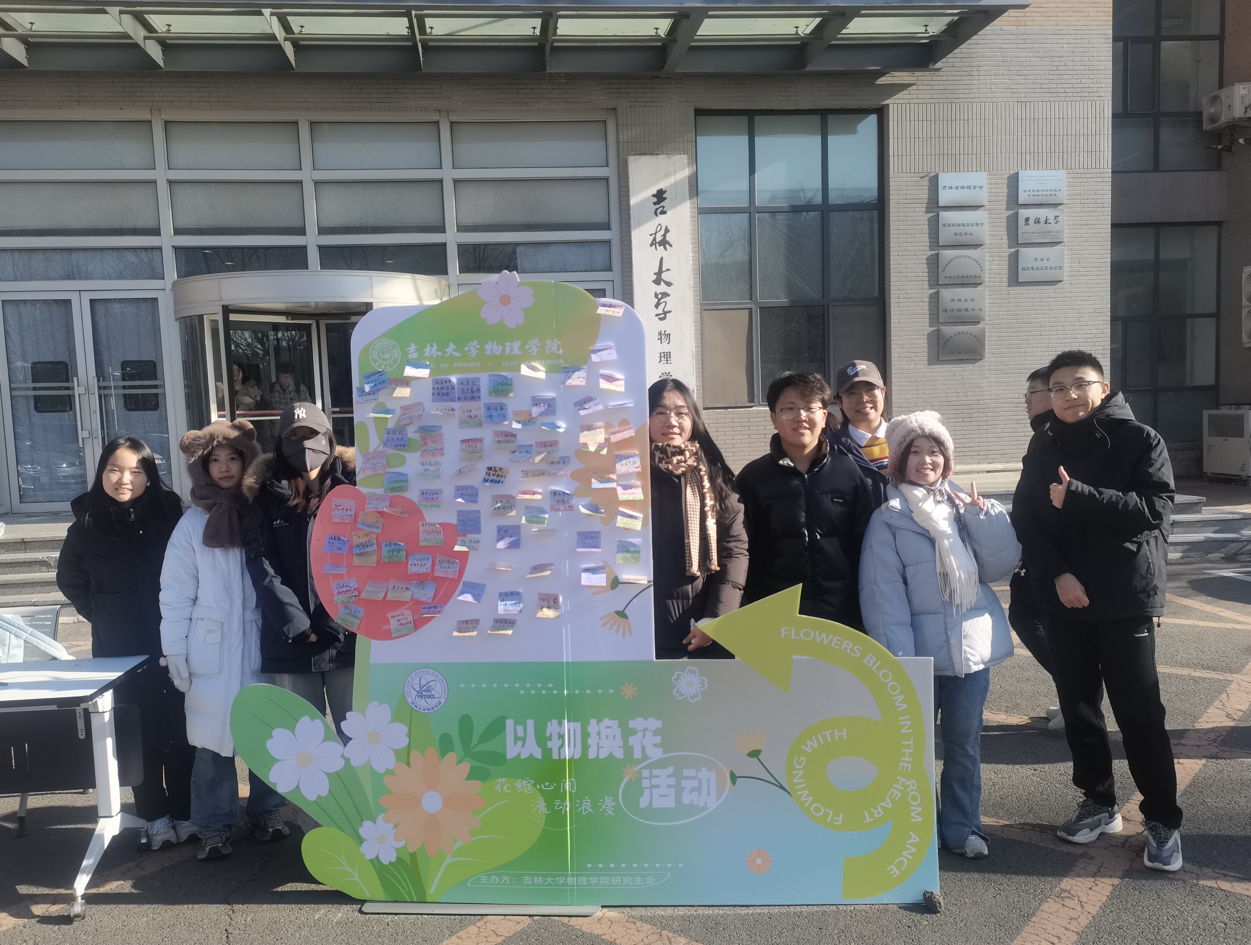 研究生办公室在物理楼门前举办“花绽心间,流动温暖——以物换花”冬日活动。尽管气温骤降,学院百余名师生带着满满的祝福和故事热情参与到活动中来,温暖了彼此的心。